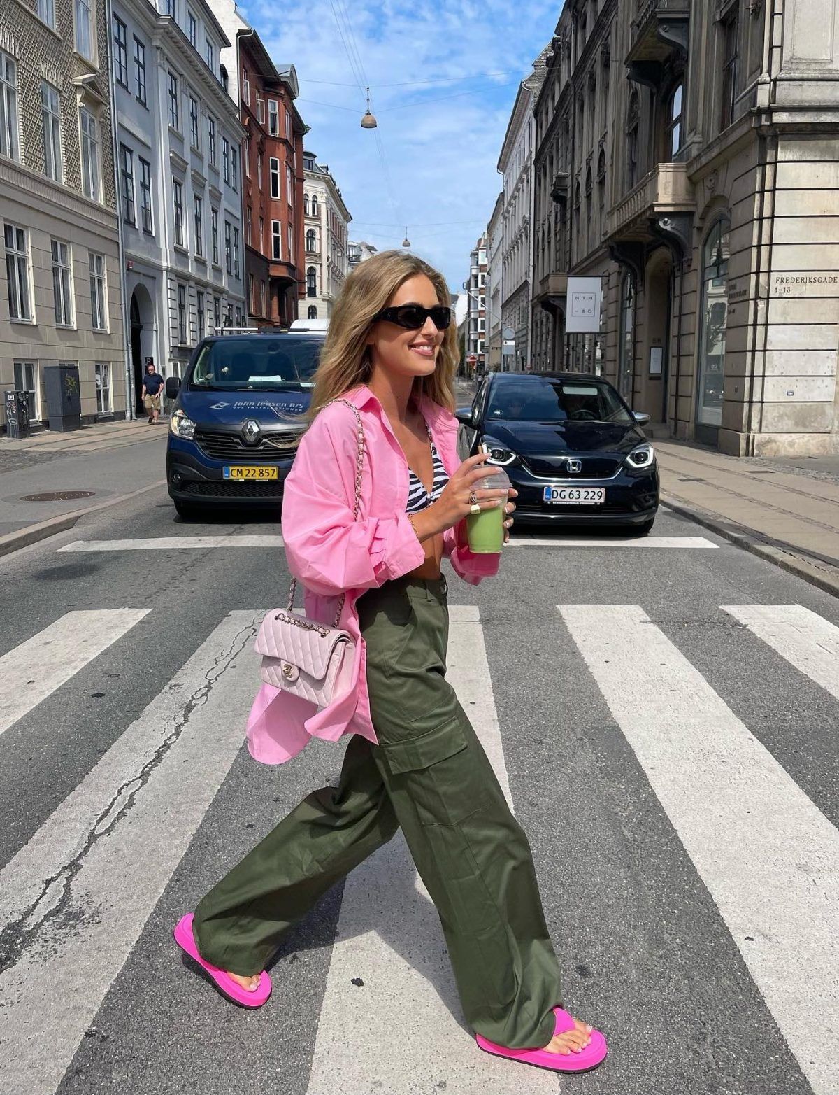 Si en cambio estás transitando el paso hacia el verano, entonces los pantalones militares serán tu ítem clave para esos outfits más relajados. ¿Alguna vez pensaste en que el rosa podía lucir bien junto al verde militar? Pues, esta influencer nos deja en claro que este dúo de colores es una combinación que debes probar.