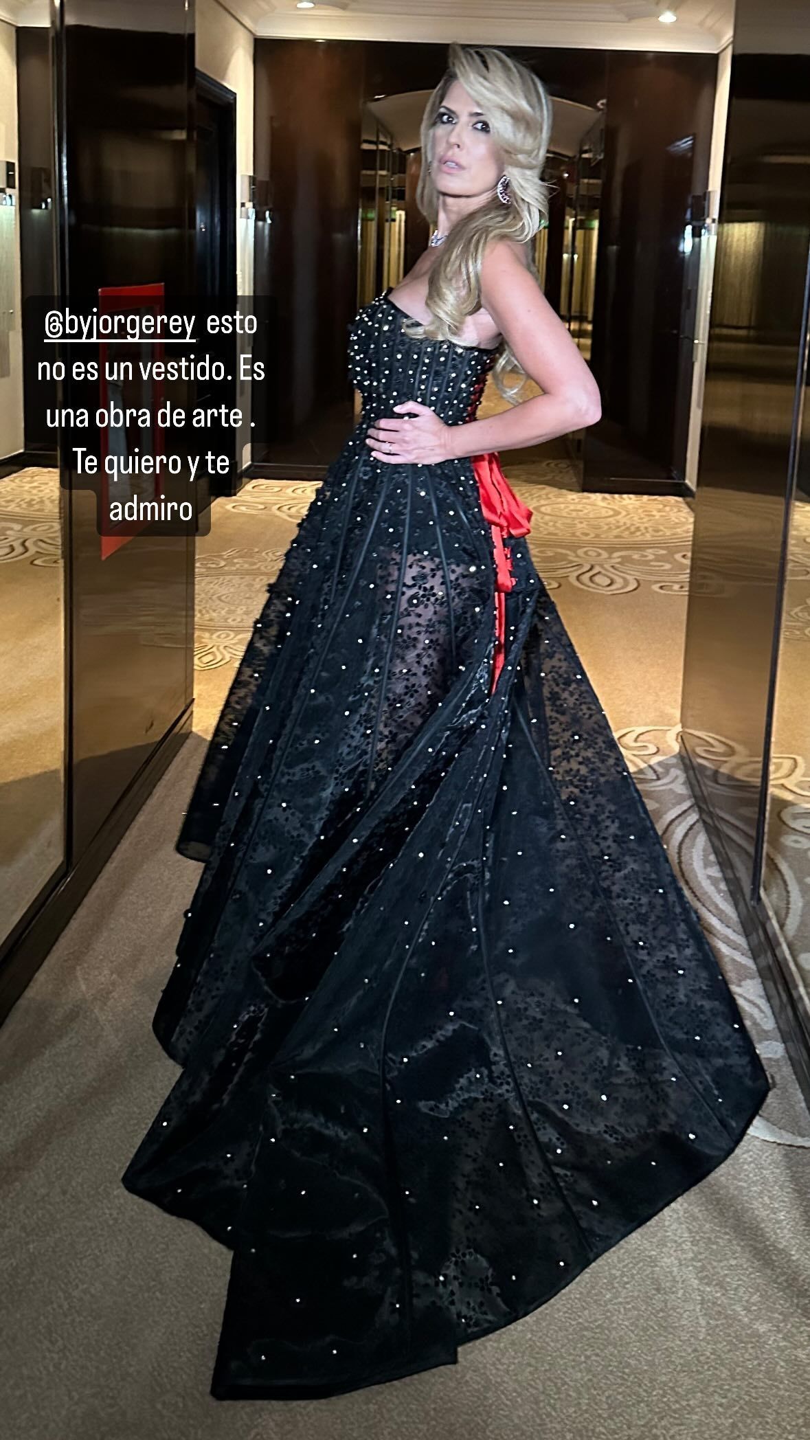 Isabel Macedo caminó por la alfombra roja con un maravilloso vestido negro, diseñado por Jorge Rey. La pieza de corset escote palabra de honor y falda semi catedral de transparencias fue un acierto absoluto. Los apliques de cristales por todo el diseño, el lazo rojo trasero y las bragas altas fueron los detalles más originales.
