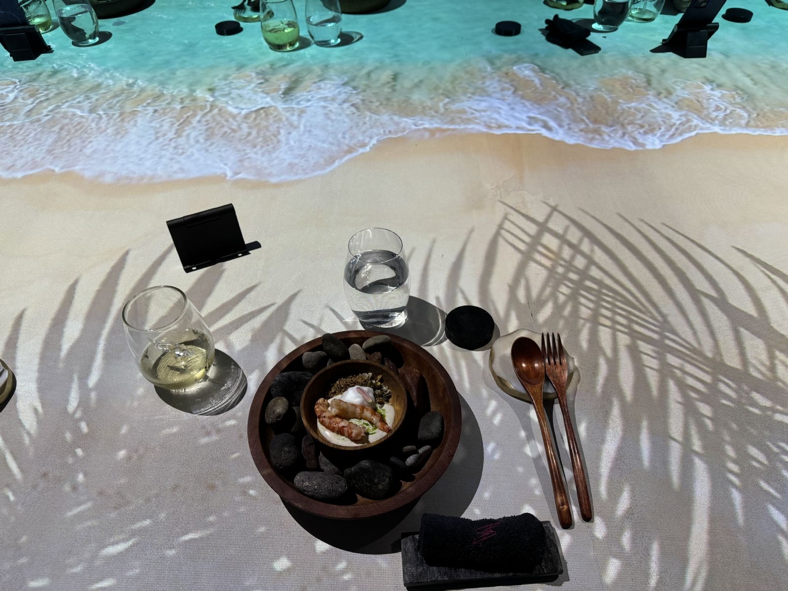 Pero cada uno de los pasos además es parte de una puesta teatral en donde la gente del servicio se sumerge en distintos personajes ya sea disfrazados de animales, como así también en mood Hawai para servir los langostinos en el paso "Playa" o bien con snorkel y "nadando" mientras traen a la mesa un tataki de atún rojo en el paso "Fondo de mar".