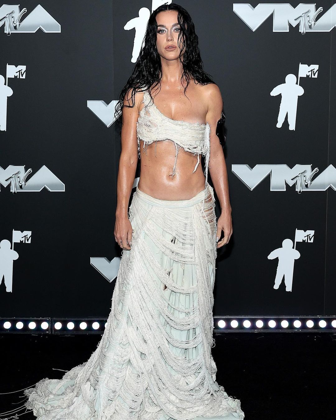 Katy Perry se apuntó por el blanco, pero desde una perspectiva más grunge. La cantante acudió con un conjunto de bralette de un solo tirante y falda de cintura baja con cola, cuya distinción se dio gracias a su efecto roto o ripped en ambas prendas. ¿Les gusta o no?