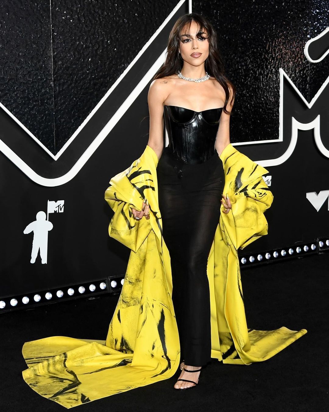 Otra de las más audaces en la alfombra roja fue Danna Paola. La mexicana optó por un look formado por dos prendas: un vestido negro - de corset de cuero y falda drapeada con transparencias - y una capa amarilla neón con estampado negro. Apostando por sandalias negras y un llamativo collar de diamantes, la famosa se convirtió en una de las mejores vestidas.