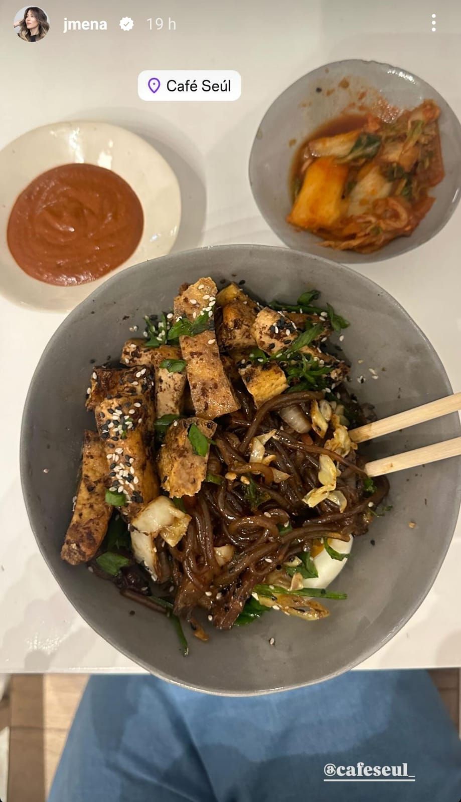 Por la estética y los ingredientes de la comida que pidió Jimena, se puede deducir que se trata de un plato con infuencias orientales: un bowl con fideos con salsa de soja y pollo marinado, con un toque verde y semillas por encima. Además, como comía con palillos chinos, se terminó de confirmar que la artista se encontraba en un lugar de comida oriental.