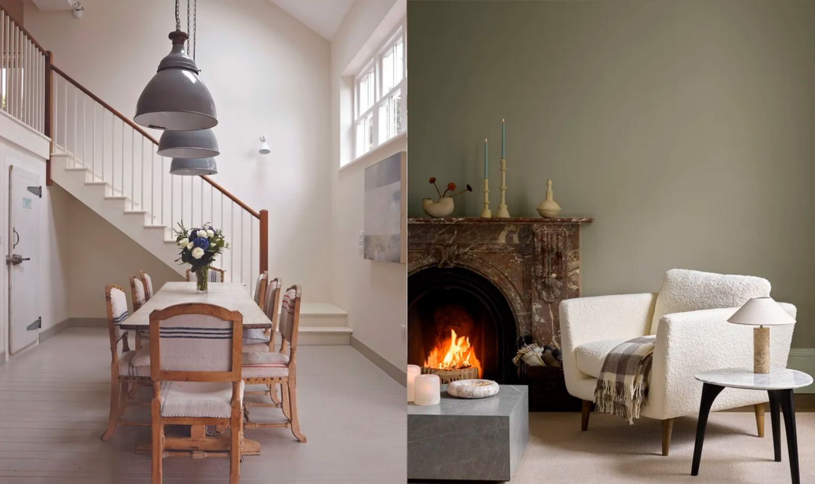 Blancos cálidos para un look clásico (izq) y gris y blanco (der). Créditos: Farrow & Ball y Benjamin Moore Hazy Skies. - Gris y blanco. Un gris apenas visible con un blanco nítido creará un aspecto atemporal y hará que una habitación se sienta luminosa y aireada. Sin embargo, no todos los tonos de blanco van a funcionar con cualquier tono de gris. La regla general es combinar los blancos más cálidos con grises más cálidos y grises de tonos fríos con blancos más puros.