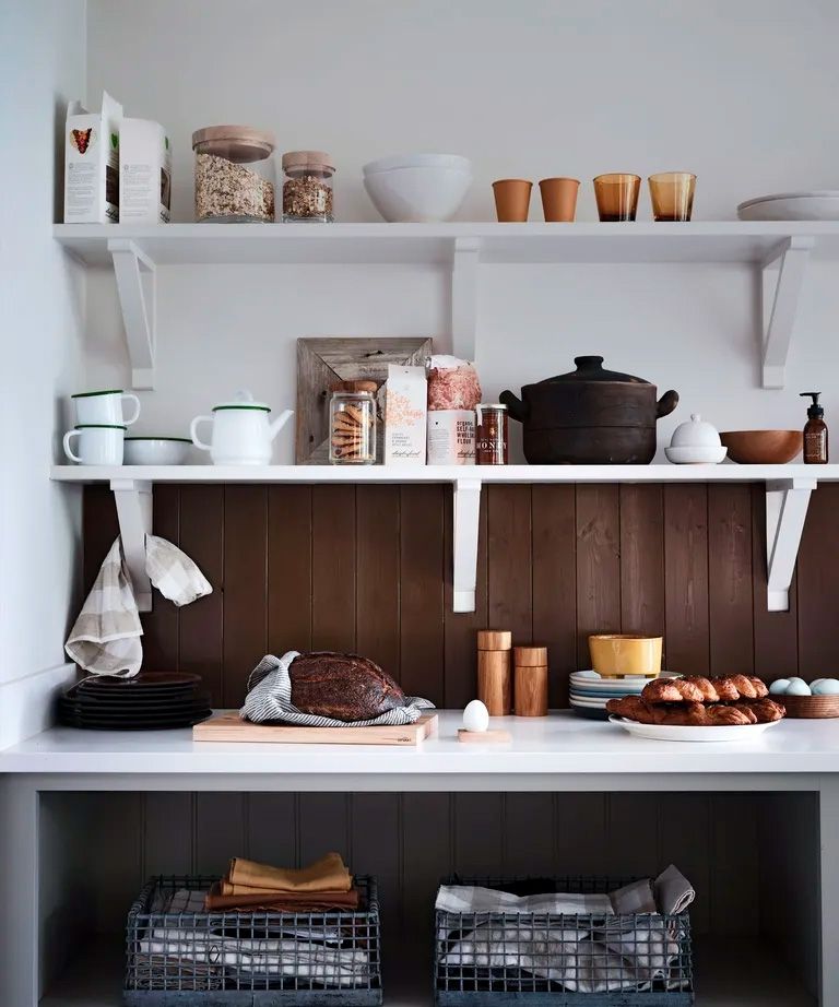 - Lo bueno de exhibir los artículos de cocina en estanterías abiertas es que pueden aportar color, textura e interés a un espacio.