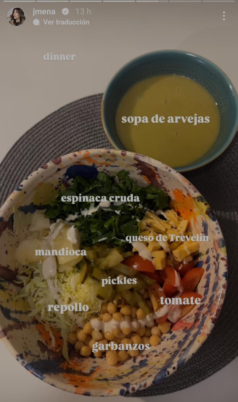 La cantante de hits como La Cobra y Flor de Involución esta vez degustó una cena súper variada, nutritiva y, a la vez, muy sana. Jimena dividió su comida en un plato fresco y otro caliente, para hacer frente a las bajas temperaturas que hacen en Buenos Aires.