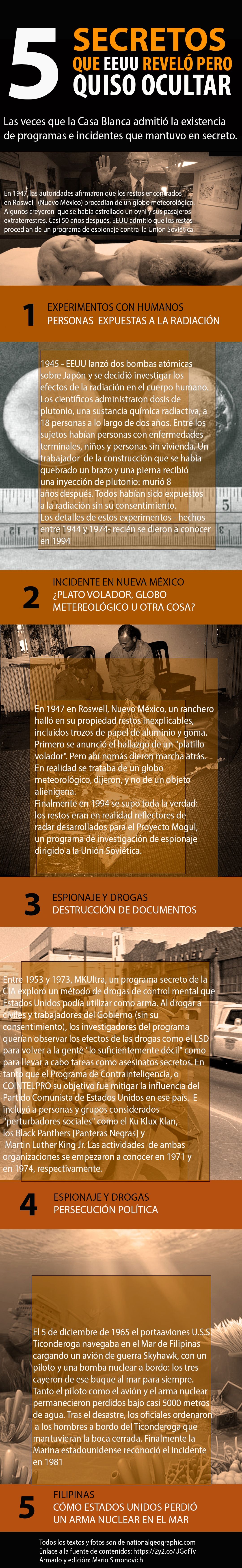 Cinco casos en los que el Gobierno de los Estados Unidos acabó admitiendo la existencia de incidentes e inclusive programas que inicialmente mantuvo en secreto. Los detalles, en un gráfico explicativo