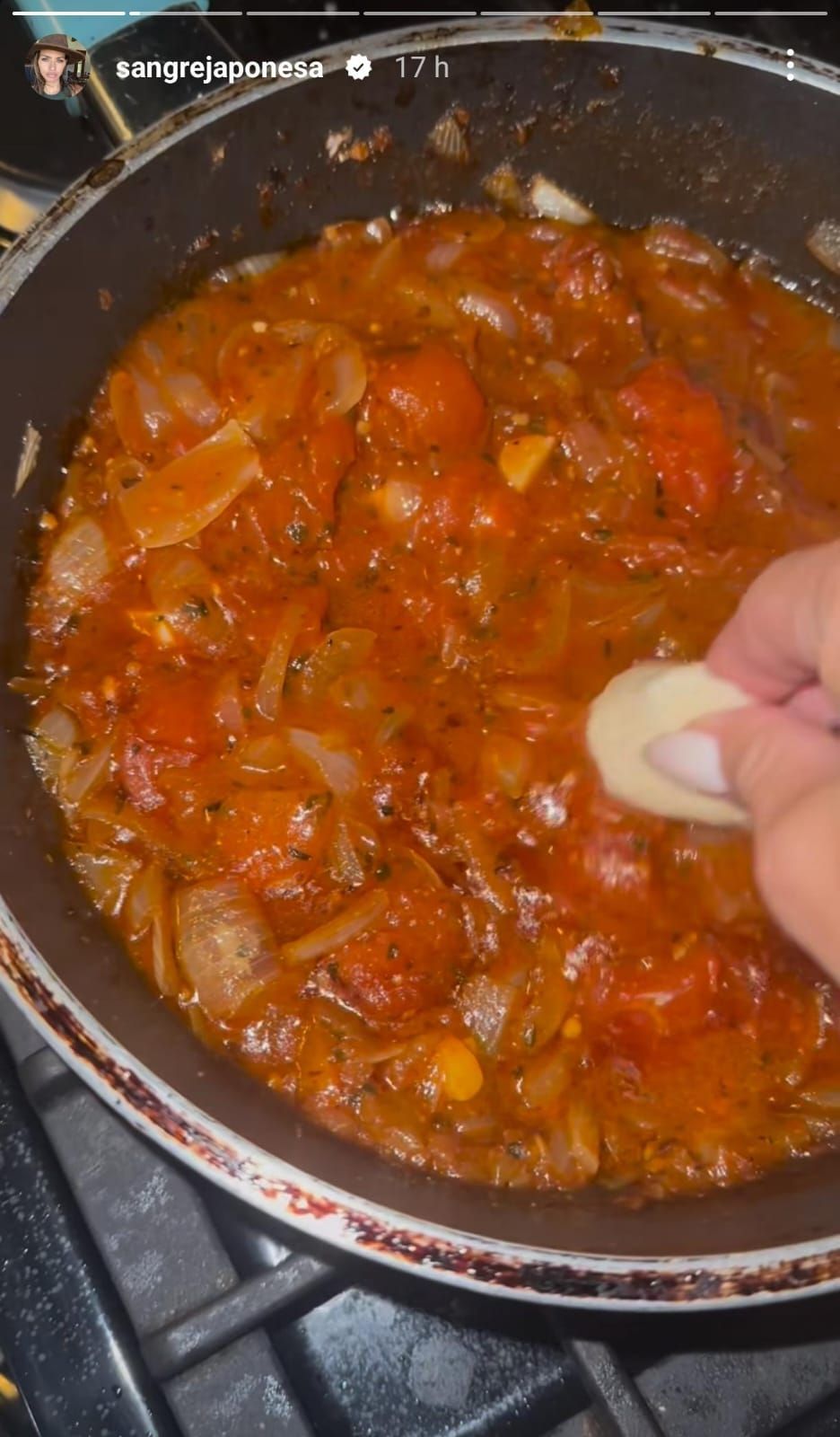 El primero posteo del domingo de la actriz de tiras como Casi Ángeles se basó en enfocar la olla donde preparaba una suculenta salsa de tomate, ideal para pastas, y mojaba el pan en ella. Acto seguido, la celebridad le acercó el pan a la boca de su hijo menor, Amancio, y éste aprobó la comida de su madre.