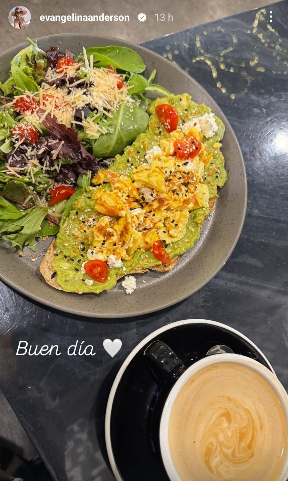 En una de sus historias de Instagram, Evangelina les dejó ver a sus fans el suculento desayuno que se pidió en un restaurante al que acudió por la mañana. En la imagen, se puede ver cuán potente es la primera comida que Anderson ingiere en sus rutinas diarias, en línea con muchos nutricionistas que consideran a la ingesta de proteína temprano como un pilar para regular el hambre que se tendrá a lo largo del día.