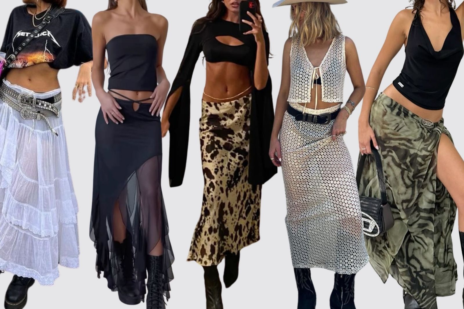 Con diferentes texturas y tramas como encaje, hilo, transparencias y estampados, las faldas largas son un ¡sí! para darle un estilo boho chic a tu look, combinadas con prendas sujetas al cuerpo o también holgadas. La clave: una faja o cinto que acompañe.