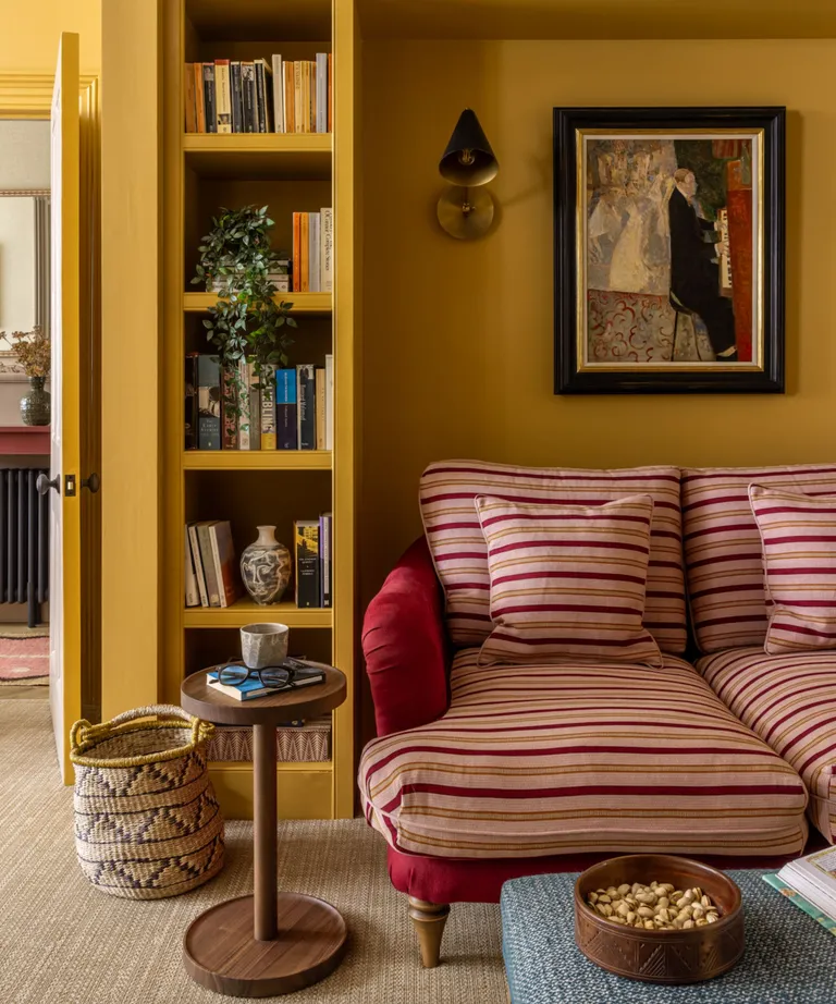 - Rojo y amarillo terrosos y apagados. Esta combinación crea una sensación maravillosamente cálida y terrosa, que se complementa con una alegre tela de rayas rojas y amarillas en las almohadas del asiento y del respaldo.