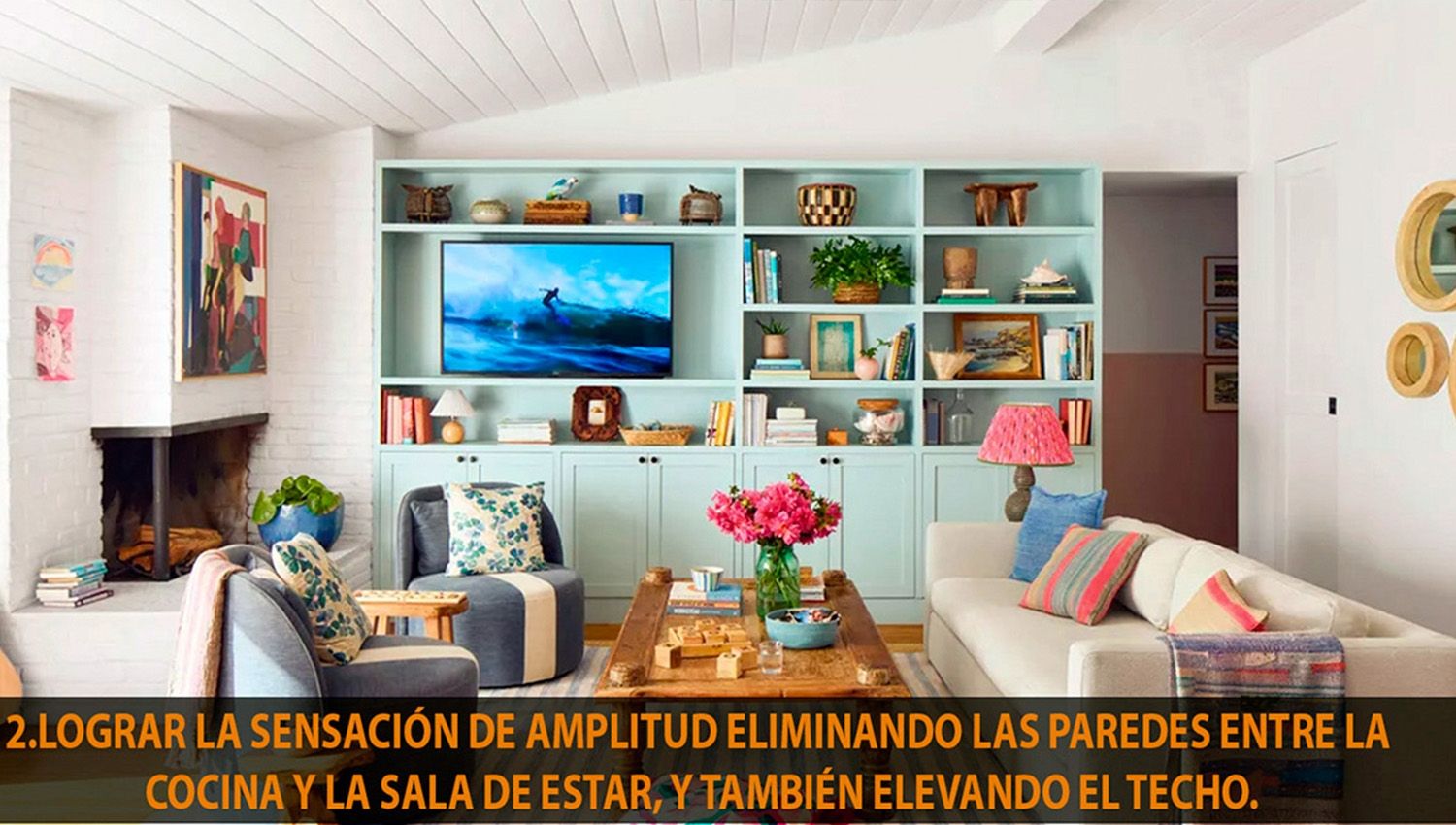 - Lograr la sensación de amplitud eliminando las paredes entre la cocina y la sala de estar, y también elevando el techo. .