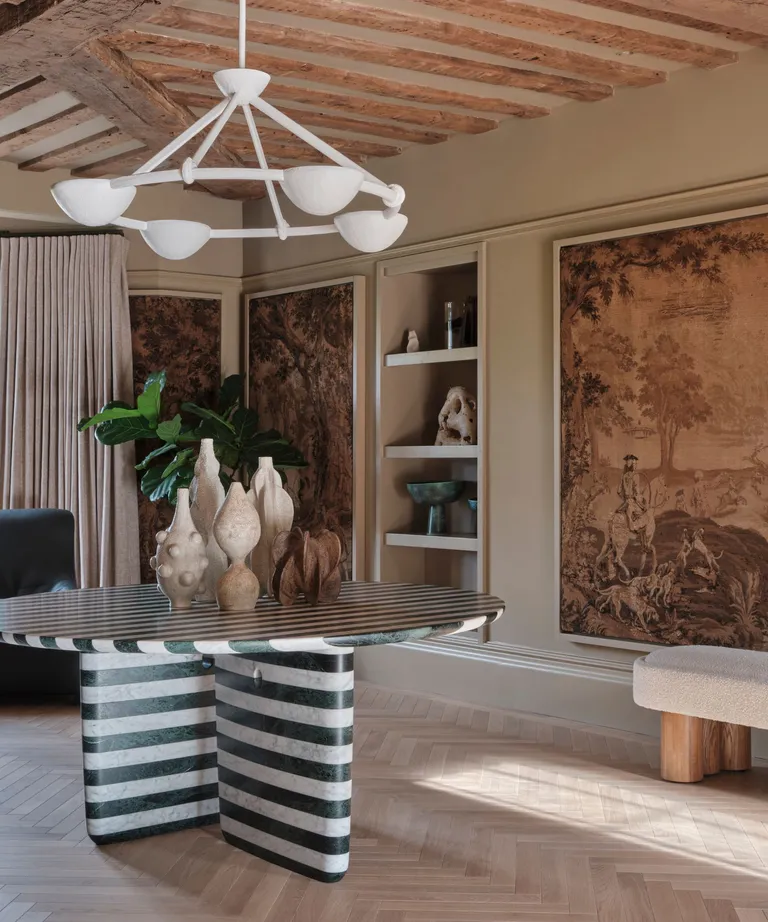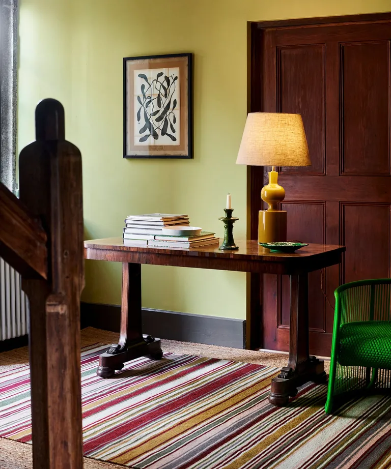 - Elegir un empapelado con rayas vintage porque son los que predominan en las tendencias de empapelados de este 2025. La belleza de la técnica vintage reside en que puede suavizarse con una decoración más neutra o realzarse con otras piezas de rayas llamativas.