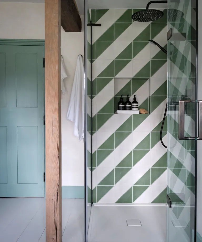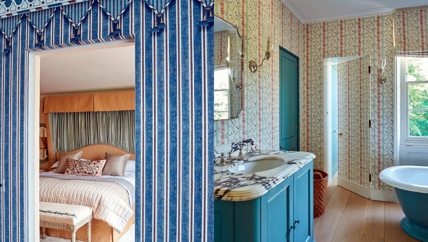 Habitación con alfombra rayada (izquierda) y un baño con azulejos de pared con patrón de diseño con rayas (derecha). Créditos: Tate y Darby / Violet y George..