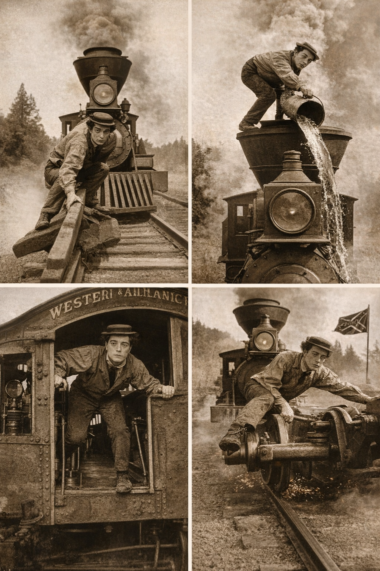 La película gira en torno a una persecución ferroviaria real, con locomotoras auténticas, vías verdaderas y escenas de acción que hoy resultarían impensables sin efectos digitales. Keaton no solo actuó: diseñó cada gag y realizó personalmente la mayoría de las acrobacias.