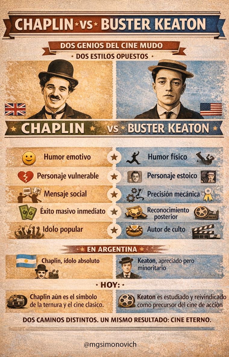 Mientras Charles Chaplin dominaba el cine mundial con historias emotivas y personajes entrañables, Keaton construía un humor más frío y exigente. Su célebre “cara de piedra” contrastaba con la expresividad de Chaplin.
