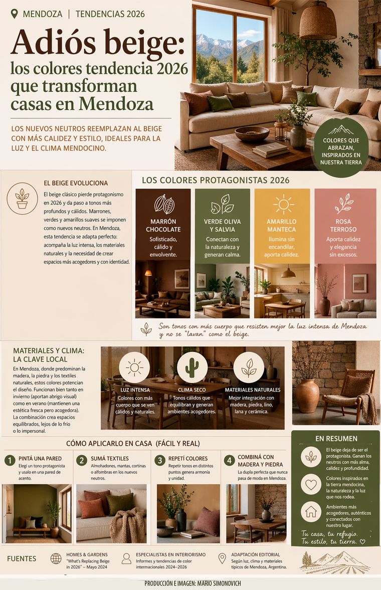Amaury LaparraEl beige clásico pierde protagonismo en 2026 y da paso a colores más profundos y cálidos. Marrones, verdes y amarillos suaves se imponen como nuevos neutros. En Mendoza esta tendencia se adapta perfecto: acompaña la luz intensa, los materiales naturales y la necesidad de crear espacios más acogedores y con identidad.