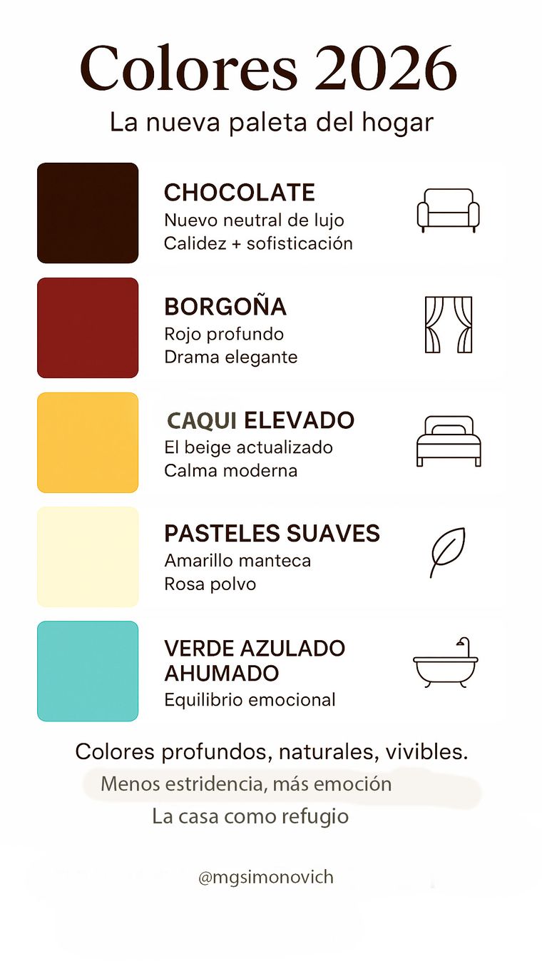 El color ya no busca llamar la atención, sino acompañar la vida real, generar bienestar y convertir la casa en un refugio. De este modo el color confirma un giro claro hacia lo esencial: tonos cálidos, profundos y con alma. La era de los colores estridentes quedó atrás para dar paso a una paleta más honesta, envolvente y emocional.