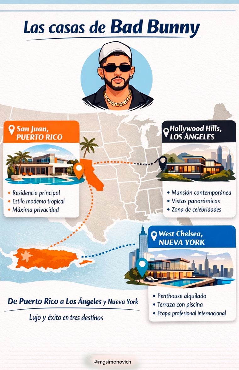 Aunque su patrimonio inmobiliario se extiende por ciudades clave del entretenimiento mundial, Puerto Rico sigue siendo el verdadero hogar de Bad Bunny. Sus propiedades en Los Ángeles y su paso por Nueva York acompañan su crecimiento artístico, pero su identidad y corazón permanecen en la isla que lo vio nacer.