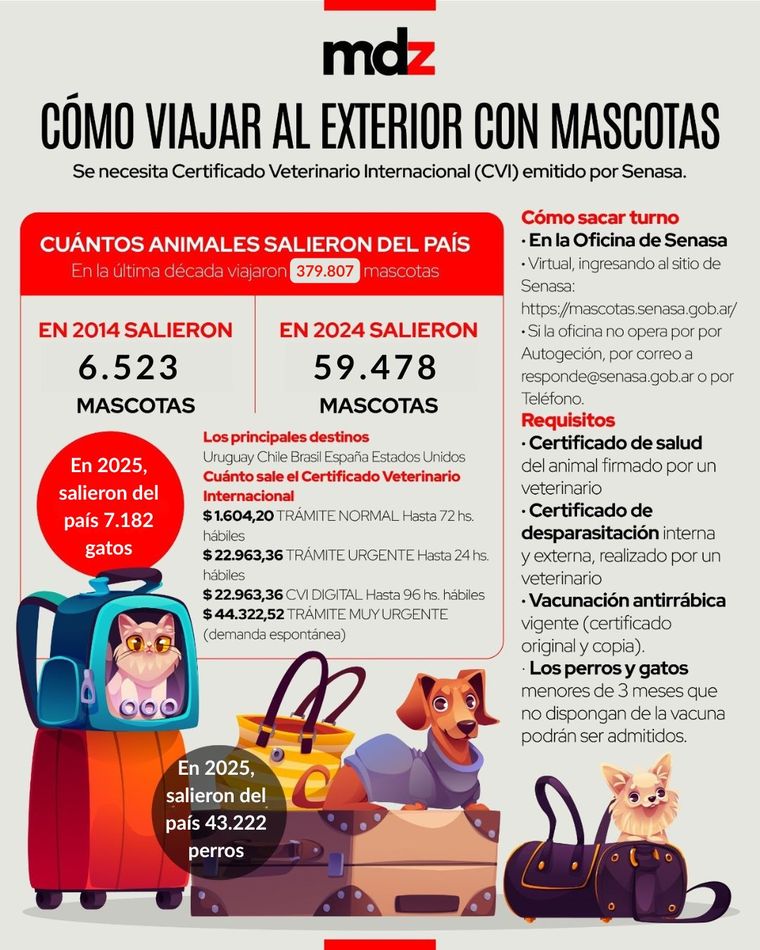 Según cifras del Servicio Nacional de Sanidad y Calidad Agroalimentaria (Senasa), entre 2014 y 2024 se emitieron 379.807 certificados de exportación de mascotas, un número que refleja un salto extraordinario respecto del punto de partida. En 2014 se habían tramitado apenas 6.523 documentos; 10 años después, en 2024, la cifra ascendió a 59.478. Esto implica un incremento cercano al 811,9% en una década, lo que demuestra que viajar con animales es una práctica instalada y en constante expansión. Mientras que en lo que va de 2025 se emitieron 50.404.