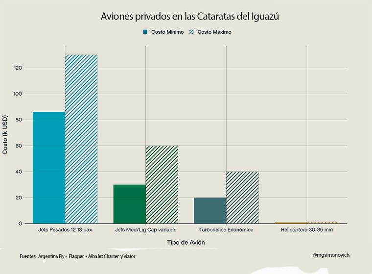 Para quienes buscan exclusividad existen vuelos privados desde el aeropuerto de Puerto Iguazú en distintos tipos de jets. También hay excursiones en helicóptero sobre el Parque provincial Iguazú, una experiencia que combina vértigo, lujo y vistas únicas de los saltos de agua más espectaculares del planeta.