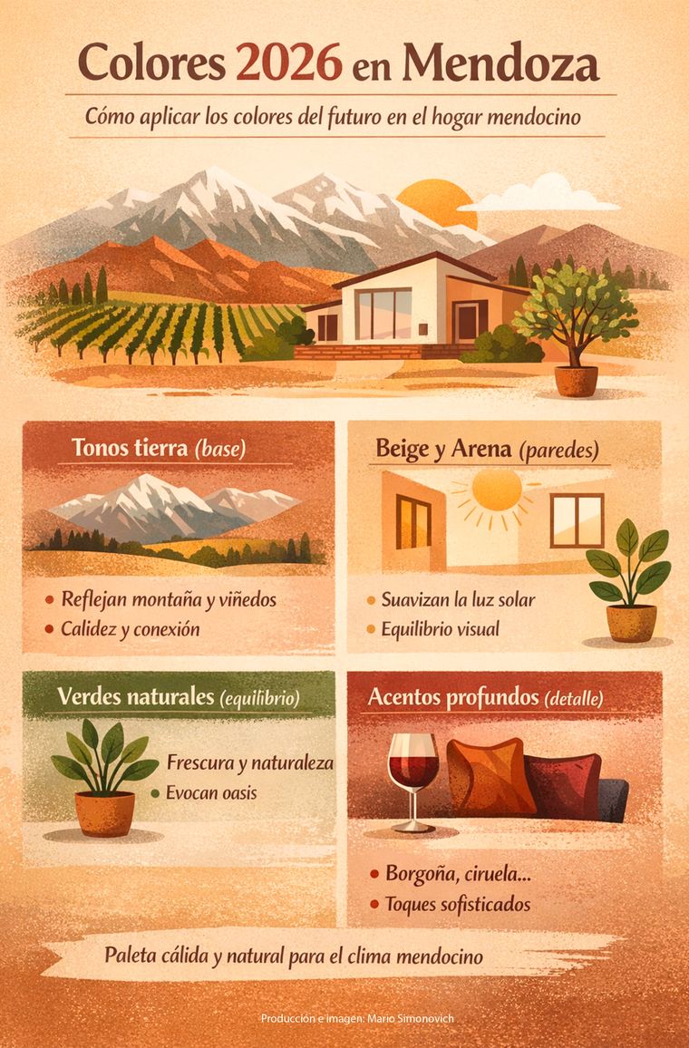 Para Mendoza, los colores 2026 toman distancia del gris y apuestan por tonos tierra, beige cálido y verdes naturales, ideales para su luz intensa y clima seco.