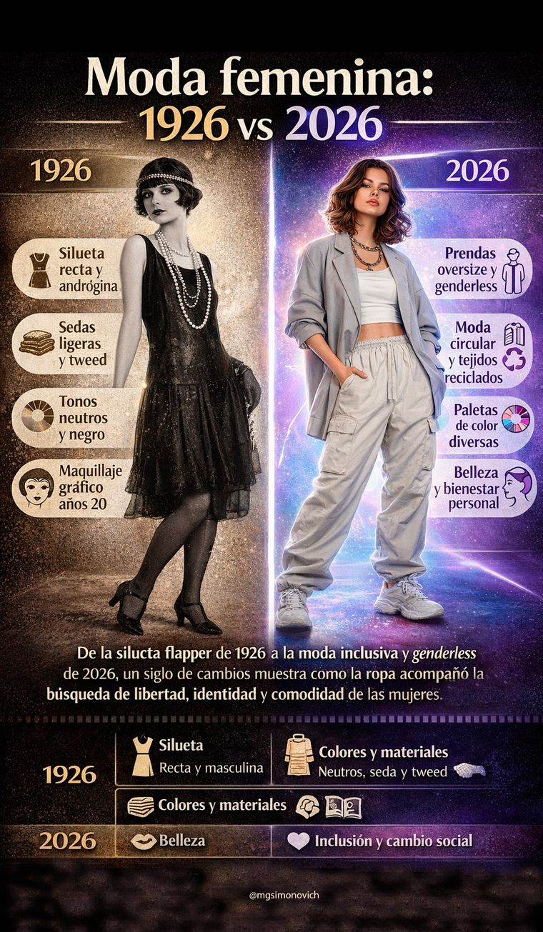 De la silueta flapper de 1926 a la moda inclusiva y genderless de 2026, los 100 años de cambios muestra cómo la ropa acompañó la búsqueda de libertad, identidad y comodidad de las mujeres.