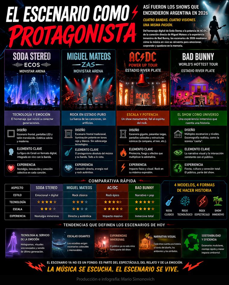 Gentileza PopArt Music/@arnedonachoEn un 2026 atravesado por grandes regresos, giras internacionales y producciones locales de alto nivel, los escenarios de conciertos de rock en Argentina evolucionaron hacia experiencias más emocionales y tecnológicas. Desde el "nuevo" Soda Stereo hasta la potencia escénica de AC/DC y la narrativa visual de Bad Bunny llegaron distintas formas de entender el show en vivo.