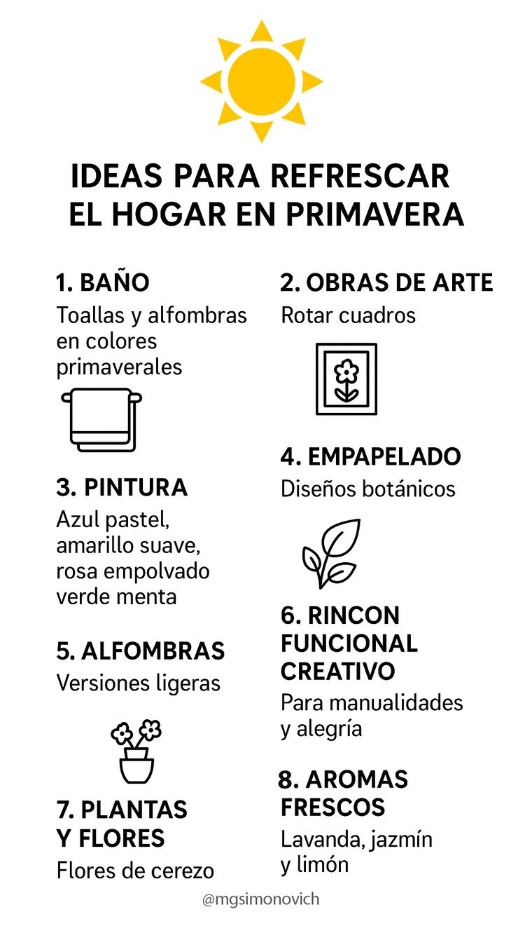 En detalle, lo que se propone es decorar la puerta de entrada con una corona, limpiar y organizar los espacios, incorporar aromas frescos, decorar con plantas y flores, crear espacios para manualidades, extender una alfombra más ligera,