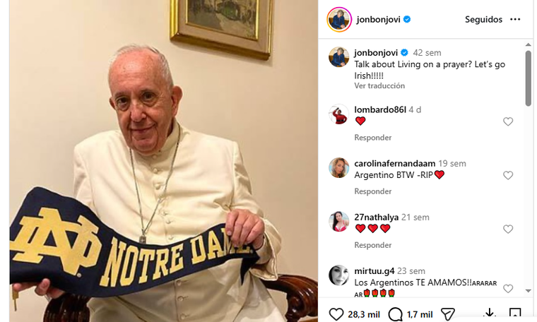 "Talk about Living on a prayer? Let’s go Irish!!!!!", Y en la imagen sale el papa Francisco, con un recuerdo de su paso por la iglesia de Notre Dame (nuestra señora) en Dublin, Irlanda, que fue el 25 de agosto de 2018. Allí Francisco pidió una “revolución del amor” y de la ternura, en un mundo marcado por el egoísmo. También habló de la importancia de que los hijos aprendan la fe viendo el amor y el respeto entre sus padres. Y se reunió con familias que enfrentan dificultades para transmitir esperanza y consuelo.