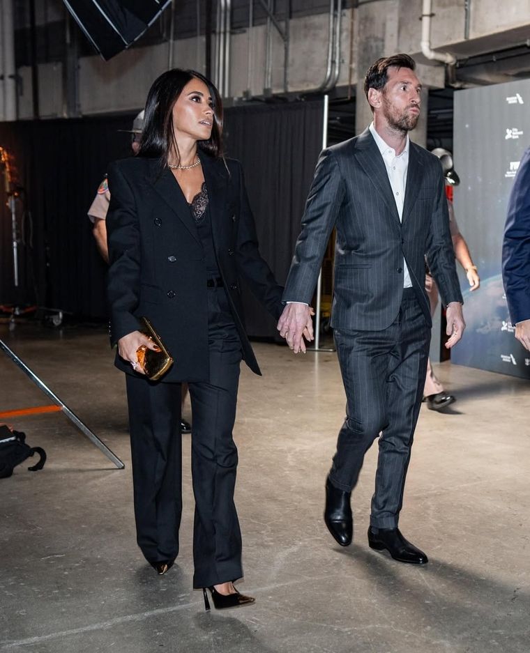 Lionel eligió un traje gris oscuro de rayas finas, con camisa blanca y sin corbata, un look pulido pero tranquilo. Antonela, en sintonía, apostó a un conjunto sastrero negro, compuesto por blazer estructurado y pantalón recto, al que sumó una blusa de encaje que le dio el toque femenino y elegante justo.