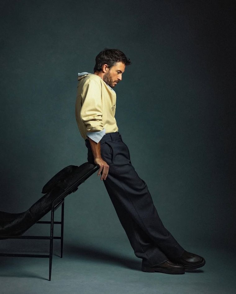El actor equilibra formas relajadas y texturas suaves, en tonos neutros que resaltan su porte y su actitud introspectiva. La iluminación tenue y el fondo oscuro potencian la atmósfera íntima de las tomas, donde cada gesto y mirada refuerzan su magnetismo.