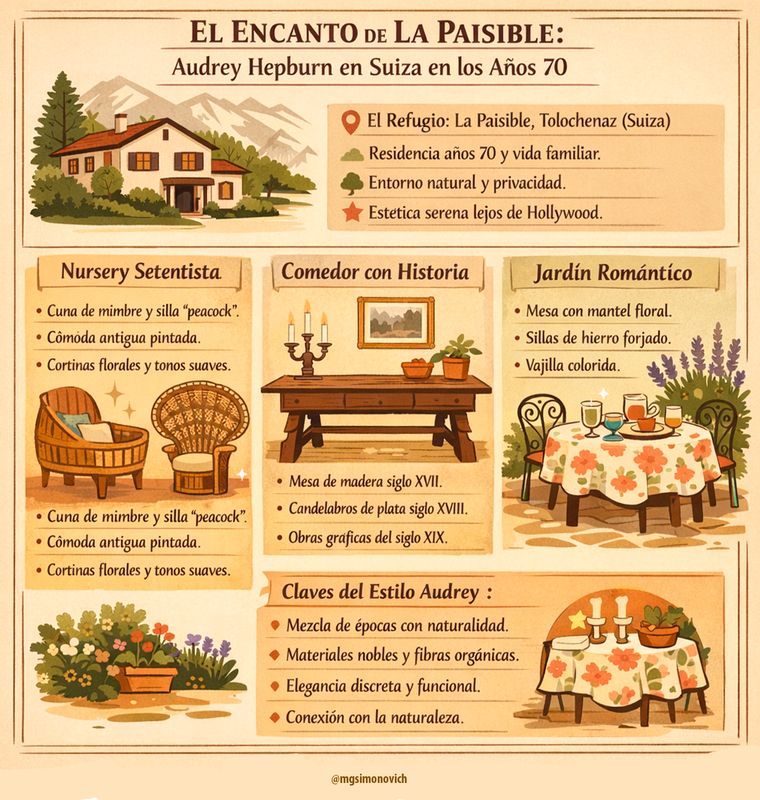 En los años 70, Audrey Hepburn encontró en Suiza el escenario perfecto para una vida tranquila. En su residencia La Paisible, ubicada en Tolochenaz, creó interiores cálidos y un jardín encantador que hoy inspiran tendencias decorativas contemporáneas por su equilibrio entre historia, naturaleza y sencillez sofisticada.