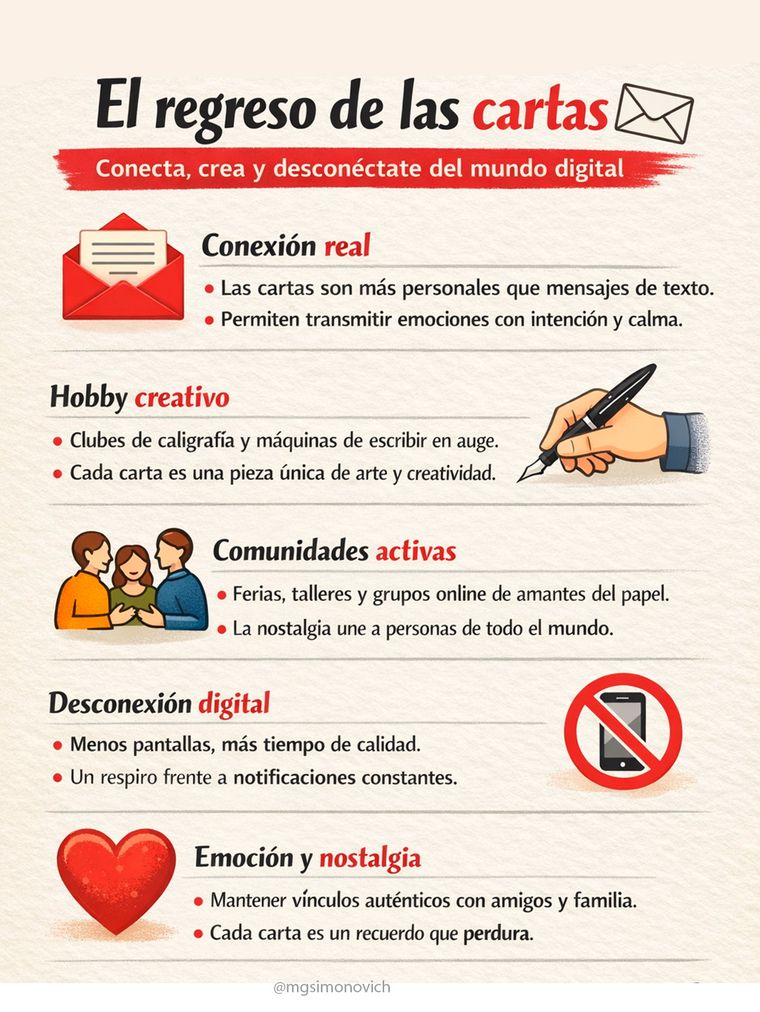 La escritura exige atención —desde elegir cada palabra hasta diseñar y sellar el sobre— y muchos la valoran como un espacio para la reflexión personal y emocional que rara vez se obtiene en la comunicación digital.
