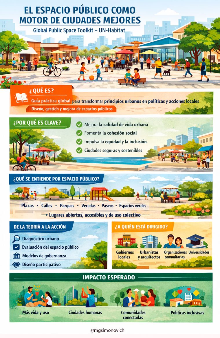 Infografía basada en la guía Global Public Space Toolkit de UN-Habitat, que es una herramienta clave para gobiernos locales y planificadores urbanos orientada a la creación y gestión de espacios públicos de calidad.