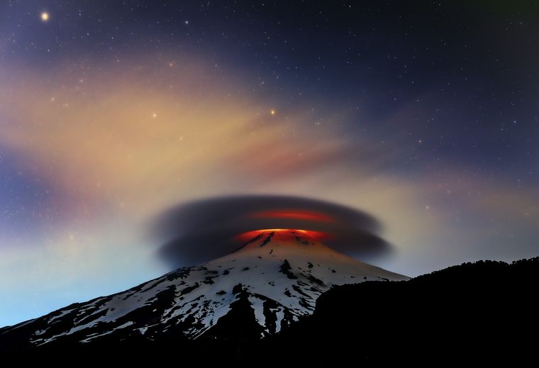 Esta foto muestra un momento normal del volcán Villarrica, ubicado en la cordillera de los Andes, en Chile. Y la fotografía de abajo integra la selección de las mejores del 2025 por la revista Nature: es el mismo lugar, con un par de nubes circulares que se iluminan con la lava del volcán chileno.