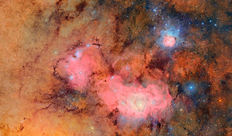"Primera luz" se llama esta impresionante fotografía de las nebulosas Trífida y de la Laguna, que combinan cientos de imágenes tomadas con una cámara digital del observatorio chileno Vera Rubin de Chile, de 3200 megapíxeles. Fuente: nature.com