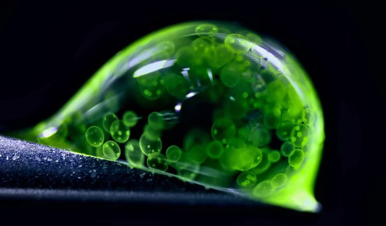 Colonias de algas Volvox , en forma de esfera, flotan en una gota de agua. Rn esta imagen microscópica tomada por el ingeniero Jan Rosenboom muestra cómo cada esfera está compuesta por cientos o miles de células individuales. Créditos: nature.com.