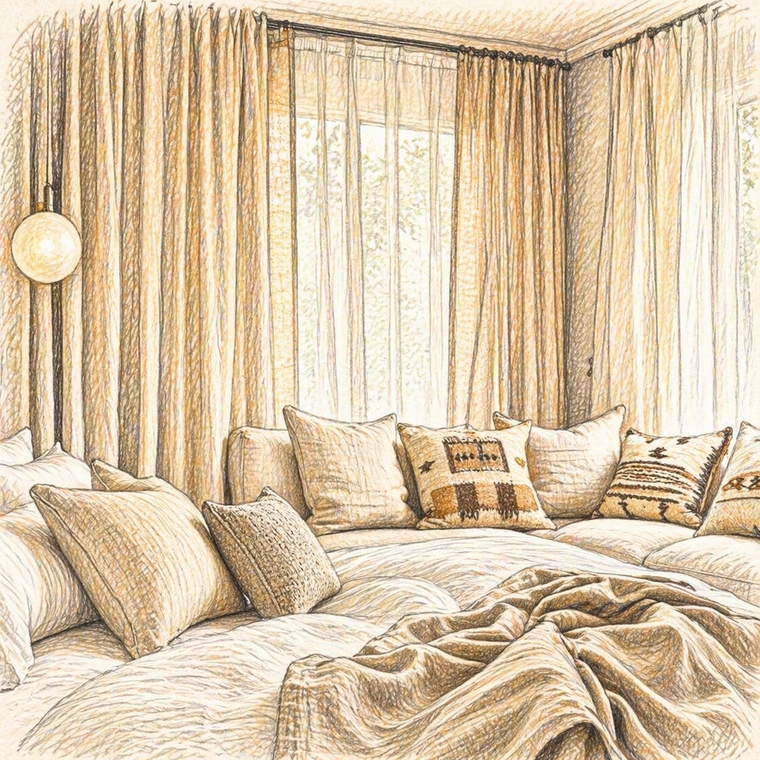 El secreto para que el espacio se vea lindo sin esfuerzo es repetir. Usar el mismo estampado o los mismos colores en almohadones, cortinas o mantas hace que todo se vea ordenado y armonioso. Es un truco fácil, económico y funciona siempre.