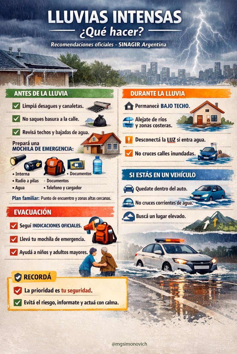 Las lluvias intensas pueden provocar inundaciones repentinas, cortes de energía y riesgos eléctricos. Antes de un temporal es importante limpiar canaletas, desagües y rejillas, no dejar residuos en la vía pública y revisar techos o filtraciones. También se recomienda preparar una mochila de emergencia con linterna, radio a pilas, documentos personales y cargador de celular para responder con rapidez ante cualquier eventualidad.