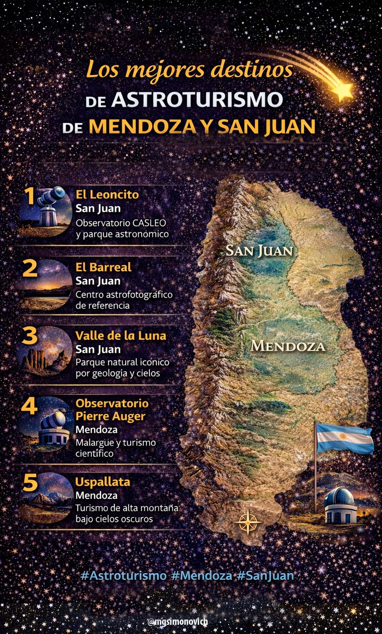 argentina.gob.arONU Turismo presentó en la reciente Feria Internacional de Turismo (FITUR) 2026 de Madrid una guía para el desarrollo del astroturismo que incluye aportes de Argentina y experiencias certificadas en distintas provincias del país. Mendoza aparece dentro del escenario nacional con condiciones naturales favorables para esta actividad.