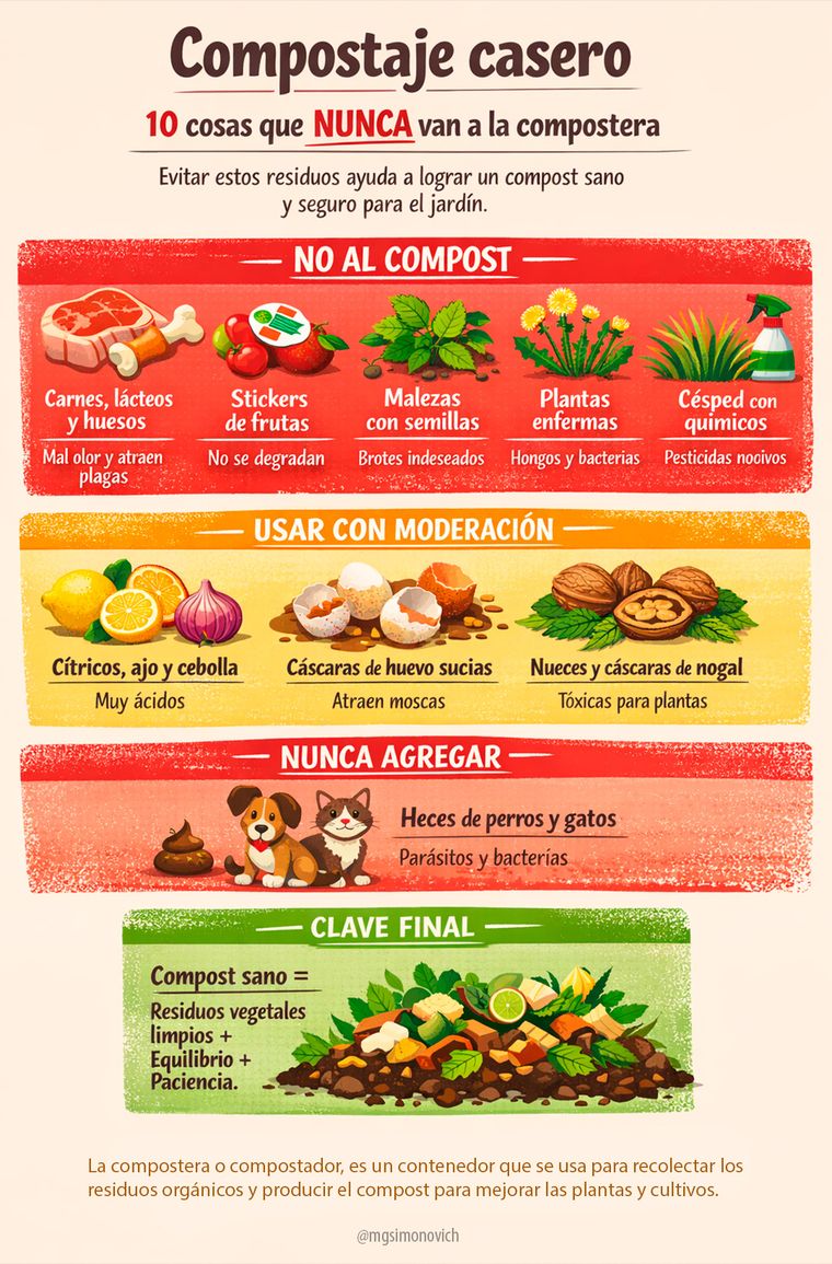 Uno de los errores más frecuentes es sumar carnes, lácteos, aceites y huesos. Estos restos se descomponen muy lentamente, generan mal olor y atraen ratas, moscas y otros animales. En una compostera hogareña, es mejor evitarlos por completo.