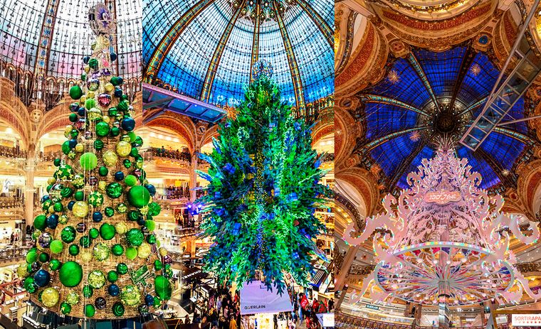 Lo que el Rockefeller Center es para los neoyorquinos, Galeries Lafayette lo es para los parisinos en Francia. Desde 1976, la emblemática tienda de París recibe a sus clientes con un impresionante árbol de Navidad bajo su icónica cúpula. Esta foto corresponde a los árboles de Navidad de los años 2022, 2024 y 2018. Créditos: ortiraparis.com.