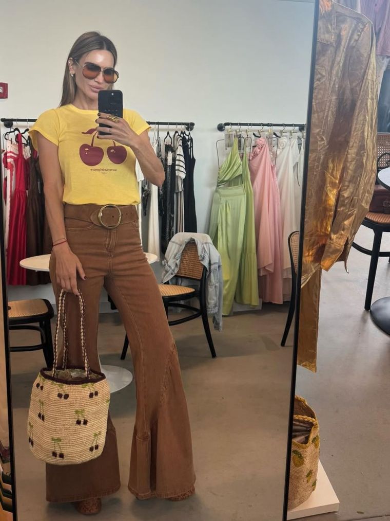 No obstante, lo más llamativo apareció arriba, en donde rompió con la lógica más clásica de su estilo y lució una remera manga corta amarilla con estampado frutal, un detalle que remitió directamente a la estética de los años 70.