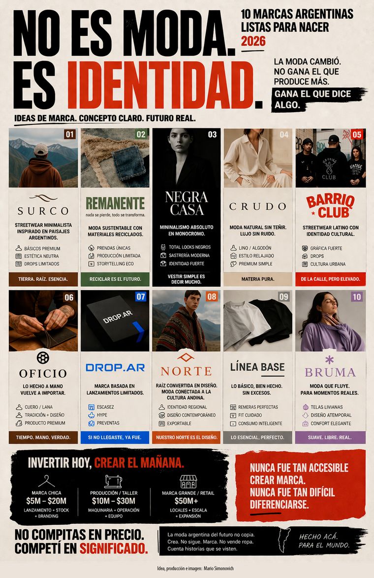 Emprender en moda sigue siendo posible en Argentina. Lanzar una marca puede requerir entre $5 y $20 millones, mientras que escalar a producción o retail implica inversiones mayores. Estos valores surgen de costos reales del mercado (producción, stock, branding). La clave no está en competir por precio, sino en construir una propuesta clara y diferenciada.