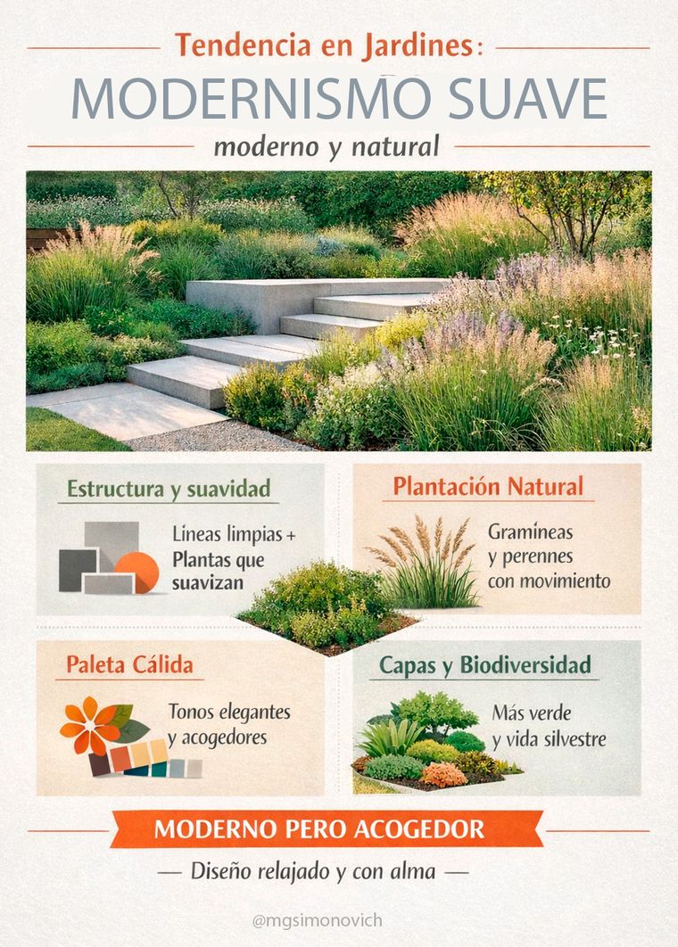 El modernismo suave surge como respuesta al minimalismo extremo. No reniega de las líneas rectas ni del orden visual, pero los combina con una plantación más orgánica. El resultado es un jardín que se percibe diseñado, pero no artificial: hay reglas claras, aunque la naturaleza tiene más protagonismo y libertad para expresarse.