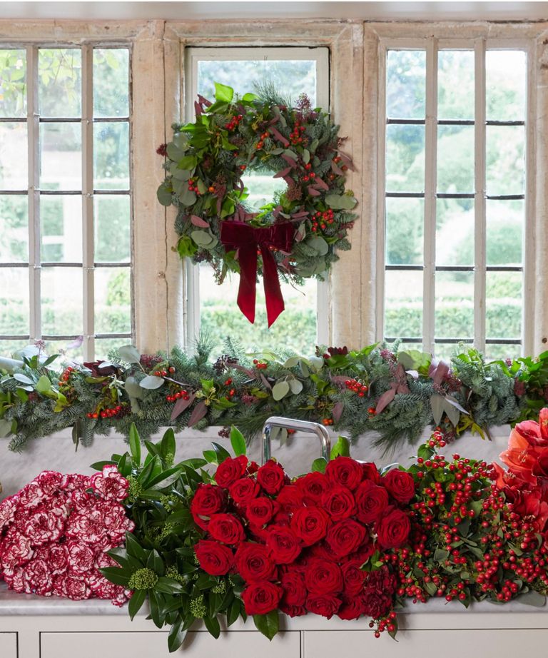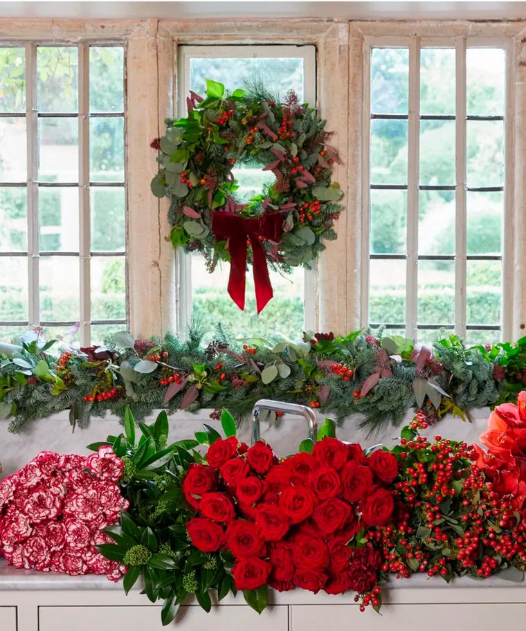 Incorporar verde natural sin ocupar espacio: coronas en alacenas, guirnaldas en marcos y lámparas.
