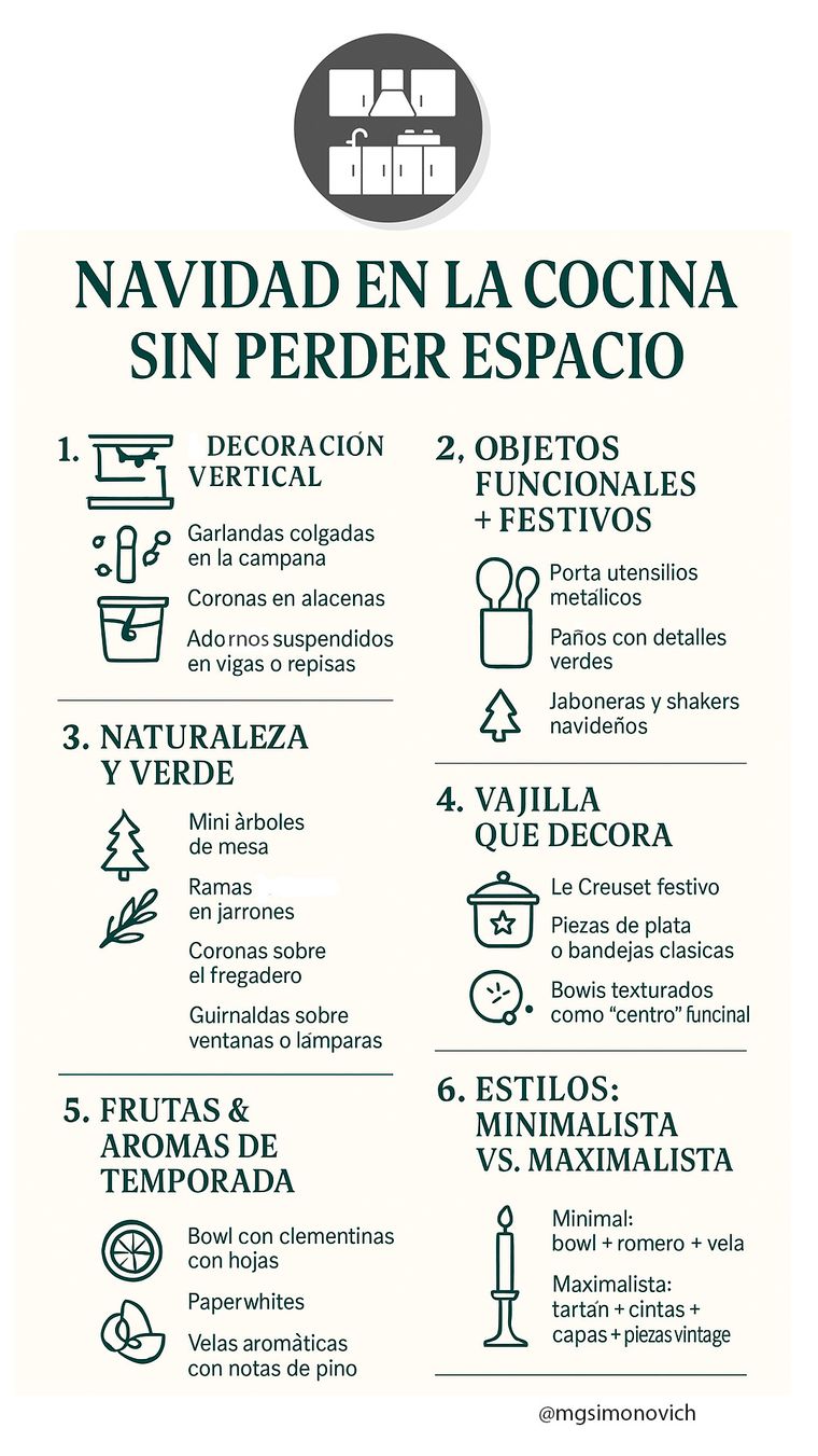 En definitiva todas éstas son Ideas prácticas para sumarle a la cocina decoración con espíritu navideño y sin perder espacio, usando la verticalidad, integrando piezas funcionales con estética festiva, sumando naturaleza, frutas de temporada, vajilla especial y velas cálidas, para en definitiva crear un ambiente cálido, familiar y útil (para ese espacio de la casa).