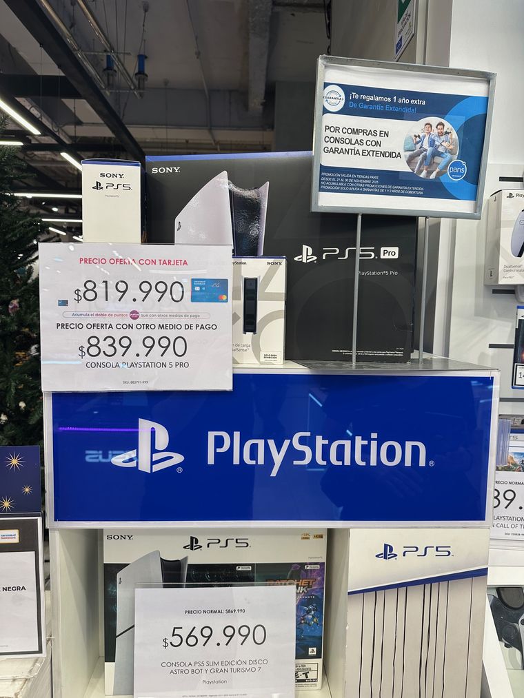 Cuando estuvimos de visita en Chile, los primeros días de diciembre, a la consola PlayStation 5 Pro en Falabella la encontramos a un precio de CLP 839.990 -esto equivale a $ 1.260.000 argentinos, aproximadamente-. La consola PS5 Slim edition Disco Astro Bot y Gran Turismo 7 tenía un valor de CLP 569.990 (algo de $855.000 argentinos) y la consola PS5 slim digital Astro Bot y Gran Turismo 7 a un costo de CLP 469.990 (alrededor de $705.000 argentinos).