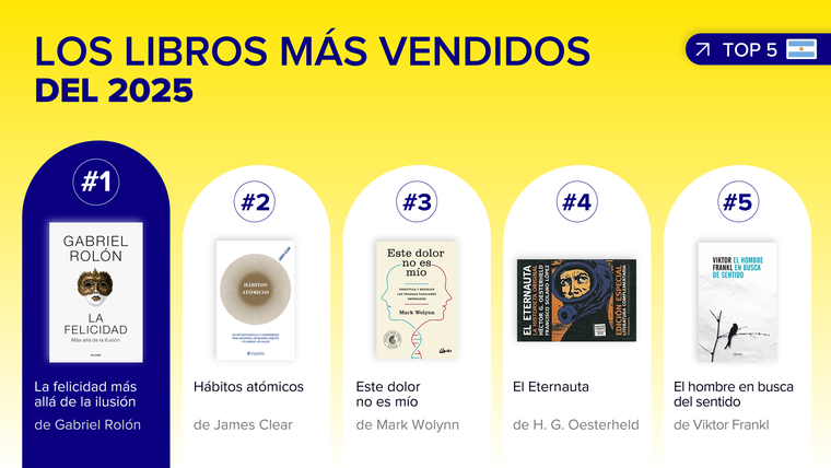 En ese escenario, durante 2025 se destacaron cinco libros como los más vendidos del año. A la cabeza se ubicó La felicidad, de Gabriel Rolón, seguido por Hábitos atómicos, de James Clear, y Este dolor no es mío, de Mark Wolynn. El cuarto lugar fue para El Eternauta, la emblemática obra de H. G. Oesterheld, mientras que El hombre en busca de sentido, de Viktor Frankl, completó el ranking, confirmando la vigencia de los grandes clásicos del pensamiento y la narrativa.