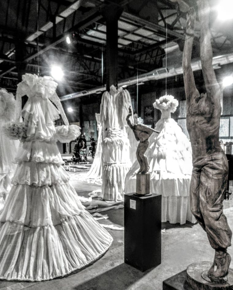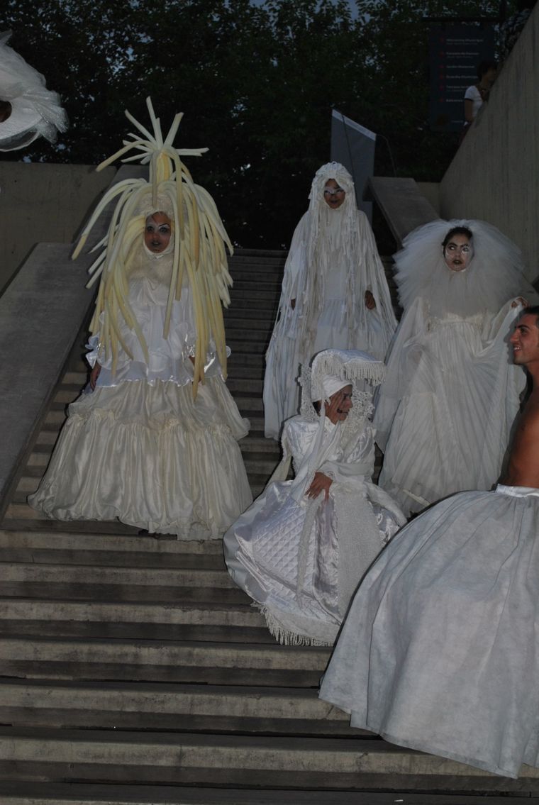 Uno de los hitos más recordados en su trayectoria fue la presentación de una serie de piezas blancas que exploraban la figura nupcial desde una perspectiva fantasmagórica. Aquella propuesta buscaba interpelar al espectador sobre los mandatos y las realidades ocultas tras el velo. El creativo detalla: “los vestidos de novia siempre me han gustado mucho, tanto en lo tradicional como en todos los significados que tiene, todo lo que está detrás de un vestido de novia, sobre todo en el pasado cuando los matrimonios eran arreglados”.
